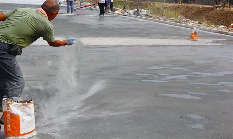 等待混凝土面层表面的游离水份散去后,才能使用强化料并以播撒的方式均匀地覆盖住混凝土的表层,用量为3kg/m2。