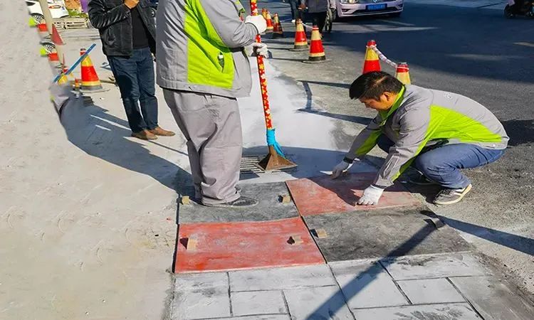 对压印后的表面进行整理,修补破损,其后均匀地用滚筒涂刷密封保护剂,封闭商品混凝土表面毛细孔,保护面层。